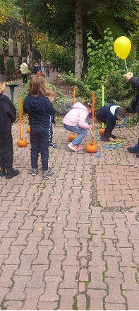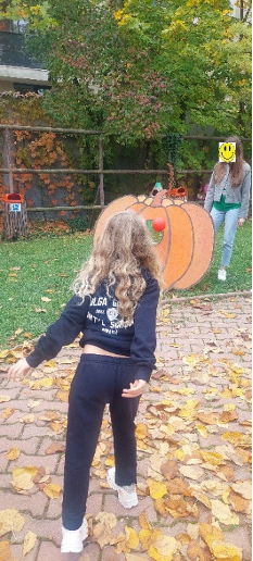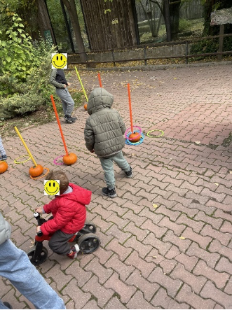 • Aruncare cu cercul colorat – Copiii au fost provocați să arunce un cerc pe un baston montat într-un dovleac, într-un joc de echilibru și coordonare.